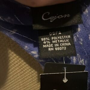 NWT Cejon scarf featuring a floral print on green to blue gradient background with silver metallic pin stripes and fringed edges. 96% polyester 4 metallic.