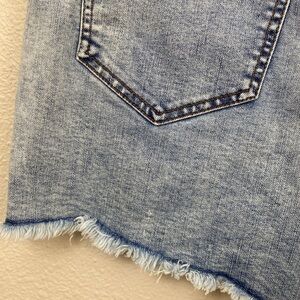 High rise, button fly, frayed stretch denim shorts with side slits. Size 31 waist.