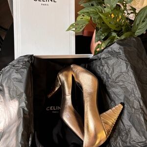 NWT Celine Metallic Leather Slip On Pointed Toe Creased Heel Pump Gold