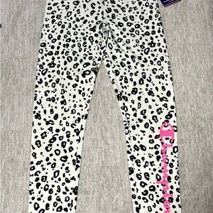 Cheetah or leopard print cream black and white with hot pink logo down leg and patch logo at hip