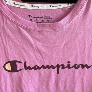 Short sleeves. Champion graphic on the front. Logo on the sleeve. Pit to pit: 19”, length: 18.5”
