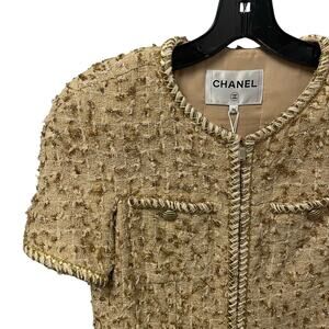 • Features: Zip up front, Short sleeve, Silk lining, 4 button closure pockets on front with gold toned hardware buttons engraved with CC, Beige gold and ecru metallic tweed knit exterior, Chanel 2019 Runway Collection Jacket