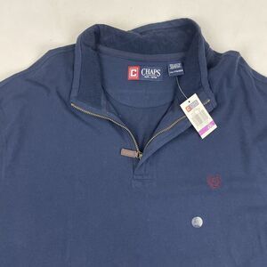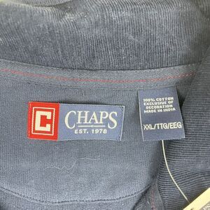 Up for sale is a brand new Chaps blue pullover top in size 2XL. This sweater is perfect for any occasion, whether it's a casual day out or a business meeting. It features a mock neck with a 1/4 zip and corduroy elbow patches, giving it a stylish and unique look. The sweater is made of cotton and is machine washable, making it easy to care for. It's perfect for the fall, winter, and spring seasons, and can be worn alone or layered with other clothing. Get ready to rock this solid pattern, long sleeve, 1/4 zip Chaps sweater.