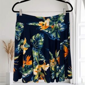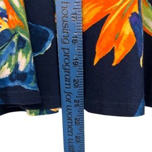 Beautiful navy blue background with topical flowers (orange, yellow, green, blue)