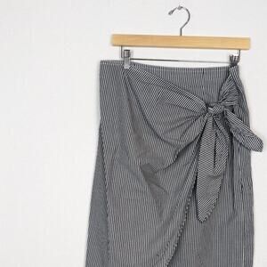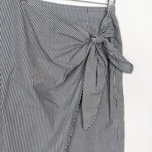 NWT Chaps Grey White Striped Wrap Skirt. A flattering wrap silhouette allows this striped cotton skirt by Chaps to steal the show with every wear. Grey and white striped pattern. Side zip closure. Poplin construction. Side tie. 97% Cotton, 3% Elastane.