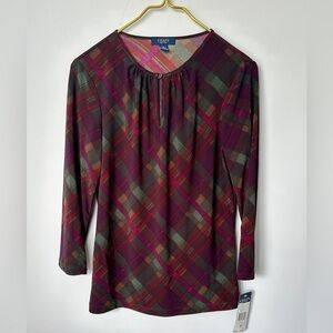 NWT Chaps Purple Maroon Plaid 3/4 Sleeve Stretch Keyhole Neck Top Women’s Medium
