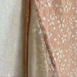 Elegant and feminine, this Chaps sheath dress features a soft pink floral lace overlay with a fully lined interior for smooth comfort and coverage. The outer lace layer includes deep side slits at the hem, allowing beautiful movement and showcasing the white underlay beneath. The sleeveless silhouette and modest scoop neckline make it ideal for spring events, weddings, or work functions. Hidden back zipper and back keyhole with button closure. New with tags.