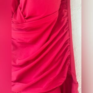 NWT Chaps one piece tummy control red/pink halter neck swimsuit with skirt; 16