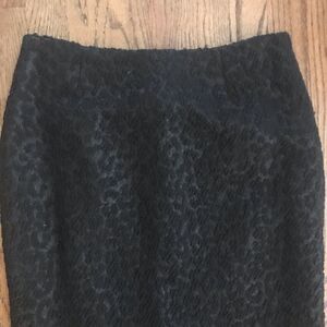 New with tags. No flaws. Suit retails for $1450. Absolutely beautiful fabric, lightly textured leopard pattern black on back with a very subtle silver metallic thread in the background. Skirt waist 29. Length 27.5. Hips 38. Jacket bust 33. Length down back from nape of neck 20.5 Waist 30 inches. From Charles Chang-Lima.