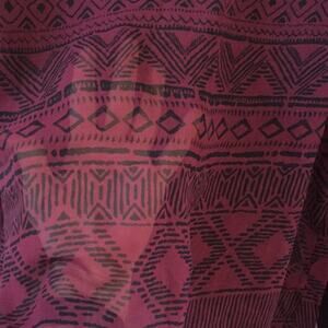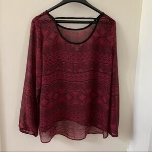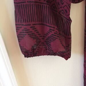 This is new with tags. It is a chiffon boho style tunic is hip level at the front and slightly longer in the back. Sleeves are long with elastic at the end. Front and back of neck are scooped slightly with the strap across the back. Tag still on it. Cleaning out the closet. Colors are wine and black