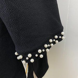 Brand new with tags classic 50s inspired black blouse with faux pearls around the collar and sleeves.