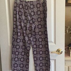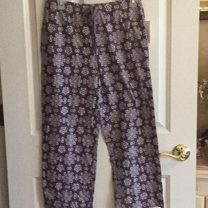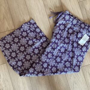 New with tags. Charter Club, a Macy’s brand women’s capri length pajama pants in Size XS and XXL. Plum and white all over geometric print, straight leg. Fully elasticized waist with non-working tie. Showing photos of front and back sides along with fiber contents and care tags. Two working side slit pockets.