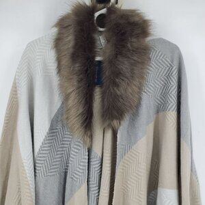 NWT Charter Club Faux Fur Trim Neutral Winter Striped Sweater Poncho Faux Wrap