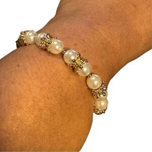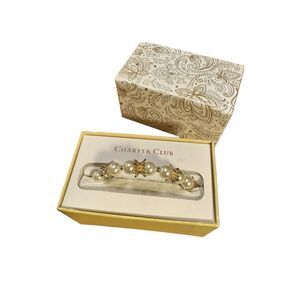 Description: Imitation pearls are set in regal-like elegance on this gorgeous Charter Club bangle bracelet. Furs a 7 inch wrist