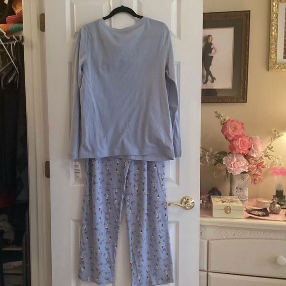 New with tags. Charter Club/Macy’s brand women’s 2 pc long pajama set in light blue. Set consists of V-neck, long sleeved solid tee shirt top and fully elasticized long pants with blue background and owl all over small print. Pant legs are straight leg. Cozy and Soft 100% cotton. Showing front and back sides along with fiber content and care tags. Sizes Available are XS and Medium