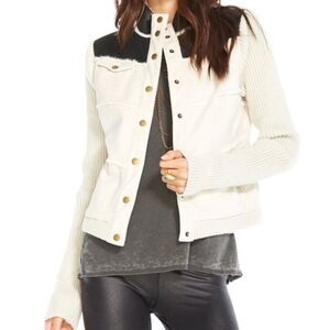 NWT Chaser Faux Suede Faux Fur Sweater Sleeve Snap Bomber Jacket w/ Pockets M