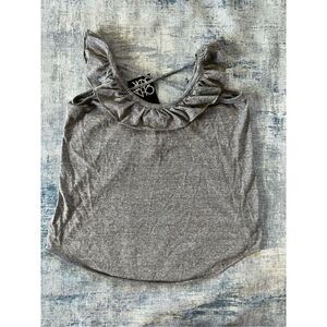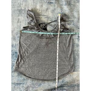 New with tags! Heathered gray tank top with ruffle lining. Scoop neckline, deep scoop back with crossed straps. Rounded hemlines.