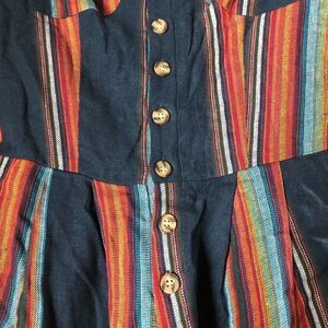 Features: Split neck with button front closure, soft lightweight navy blue multicolored striped linen blend fabric, 2 front pockets, tapered leg style, strapless, 2 back faux pockets, pleated front accents