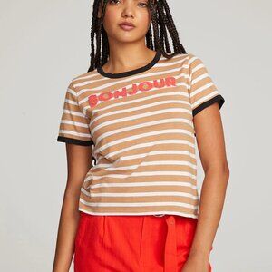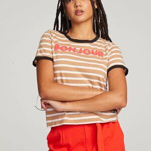 NWT Chaser Women’s Bonjour Striped Ringer Tee, Tan/White/Black/Red, Sizes S M
