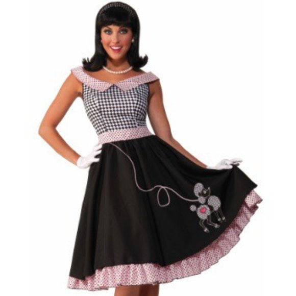 Checkered bodice and black skirt with pink polka dot off-shoulder collar, waist, and skirt lining peeking from hemline
