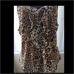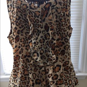 NWT Cheetah print blouse size L. Never worn, no damage. Super cute! 100 % polyester. Colors are brown, tan and gold.