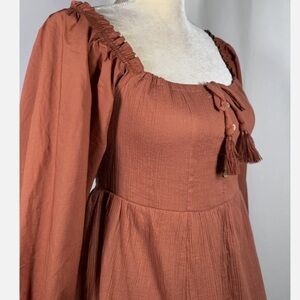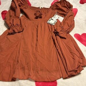 NWT Chelsea Violet Girls Mixed Media Puff Sleeve Smocked Back Dress in Rust