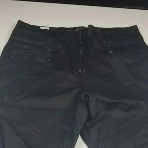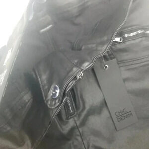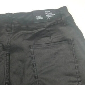 Chic Denim women's Skylar Ankle Gazer black jeans size 20. 3 zipper detail to front with two back pockets. Front zipper and inside button closure. Outer layer 100% Polyurethane. Main layer 70% Cotton, 28% Polyester, and 2% Elastane. Runs small for a size 20, so review measurements carefully. Waist 16", Rise 13", and Inseam 28".