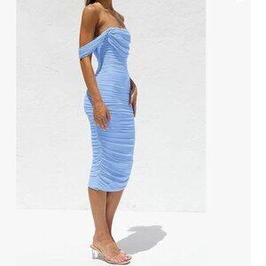 Step out in style with this chic strapless blue dress by PRETTY GARDEN. Its ruched design offers a flattering fit, perfect for any occasion.