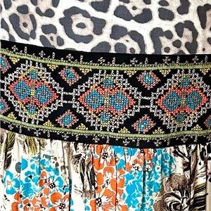 NWT chic mixed print blouse by Sharon Young. Perfectly combines animal print with floral design. Multi colored. Size medium. This flowy blouse features feminine bell sleeves & distinctive embroidered trim. It’s tunic length, 28 inches long. NEW WITH TAGS!