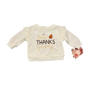 NEW WITH TAGS - SIZE 0-3M - This Chick Pea My First Thanksgiving Fall Ruffle Shirt & Pant Set is precious and perfect for fall. This set includes an ivory top with ruffle accents. "My First Thanksgiving" graphic, camel/tan leggings pants with a floral pattern. 57% Cotton, 38% Polyester, 5% Spandex COLOR is Ivory, Tan, Brown, Orange