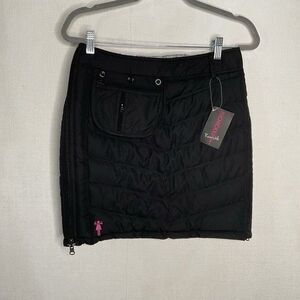 New with tags Chicked Duck Down Puffer Quilted Performance Ski Reversible Mini Skirt Women Size S Black/Gray