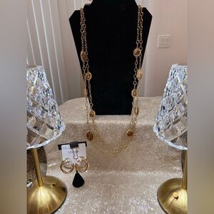 NWT Chico’s Animal long layering Necklace with matching dangle earrings. Wow! Another set of pieces in this awesome collection. Gorgeous Rare Chico’s gold & animal print long layering necklace. Gold triple hoop post earrings