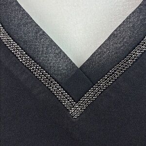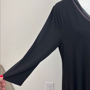 Chico's size 2, long sleeve dress in classic black. Comfortable, elegant and professional. Ball chain detailing at the neckline elevates flirty godet pleats that ensure this is a perfect look for an evening out.