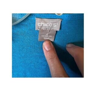 Add a touch of elegance to your wardrobe with this Chico's open-front cardigan. Beautiful blue with 3/4 sleeves, crochet lace hem, and tassel trim for a unique finish. Light and stylish, perfect for layering on any occasion.