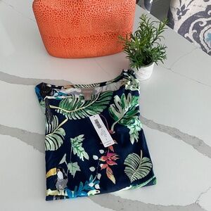 Gorgeous “Tossed Toucan” print elevated tee by Chicos can go with so many colors. Blue, green, pink, turquoise, yellow. Elbow sleeves to cover upper arms. Love this bold vibrant print! Chicos size 1 is a Med.