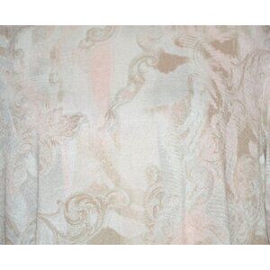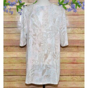 Chico's CoziSoft pullover blouse features a paisley design in tan, pink, and blue. This casual short sleeve T-shirt top offers a relaxed fit perfect for everyday wear.