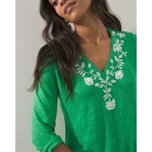 Vibrant green tunic from Chico's features a delicate white floral embroidery design, adding a touch of elegance and style.