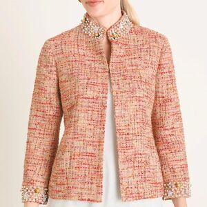 Inspired by a customer-favorite jacket from 2010, our designers updated a timeless, tweed and faux-pearl style for a new decade. Whether you wear it to work or the dinner gathering, everyone will be in awe of this flattering, tweed design—woven with neutrals, oranges and touches of pink. Floral embellishments alongside the faux pearls give it a spring-forward feel. Let it be the focal point of your outfit with jeans or dress it up a bit with slim pants and jewelry.