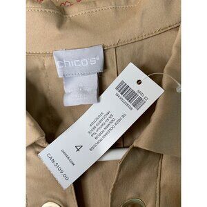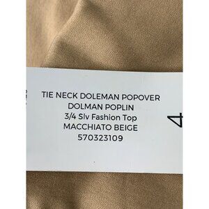 This Chico's tunic top features a stylish tie neck and comfortable dolman sleeves. Its macchiato beige color adds a touch of sophistication, making it a versatile addition to any wardrobe.