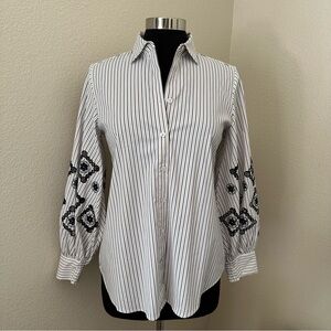 NWT Chico’s Poplin Tunic Embroidered Woven Pattern Button Up Shirt White Navy