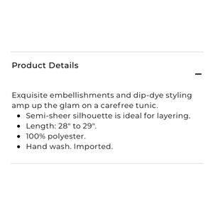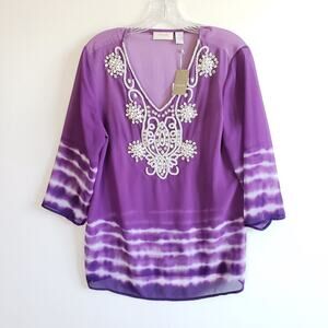 NWT Chico’s Women’s Purple Dip Dyed Beaded Neckline Sheer Top Size 1/Medium (see Chico’s size chart - last pic). Majestic Ombre Top. Retails $179!