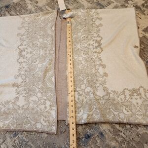 one side is a solid tan and the other has a pretty pattern with metallic gold threading.