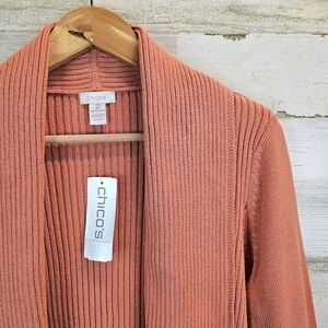 Elevate your wardrobe with this NWT Chicos Ribbed Cocoon Cardigan Sweater! Perfect for the fall-to-winter transition, this stunning terracotta peach piece is all about effortless style and ultimate comfort.