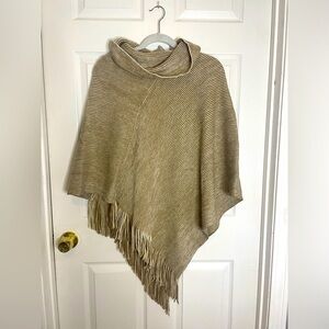 Elegant charcoal poncho with fringe accents. Ideal for chic layering.