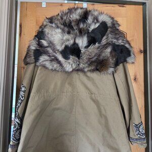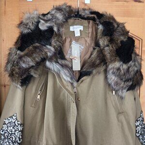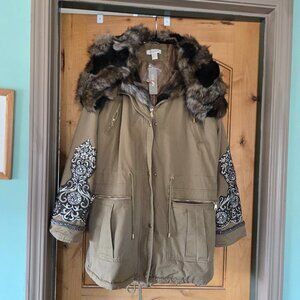 NWT Chicos Sz 3 (XL) Embroidered Embellished Parka Jacket w/Faux Fur Hood & Trim