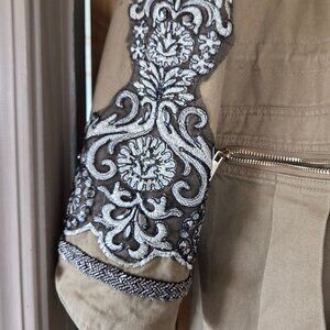 Beautiful embroidered, beaded embellishments in black and silver on both sleeves.