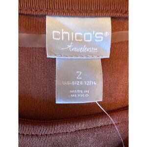 This Chico's Travelers dress showcases a sophisticated color-block design in black and rust. Crafted with a blend of acetate and spandex, it offers a comfortable fit for various occasions.