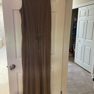 Beautiful Travelers Sleeveless jumpsuit. Color is a gorgeous Taupe. The top blouses with a high neckline and tie waist, legs are full and flowy. Shows off what you want to show and hides what you want to hide!! Easy to wear - dress it up or down!