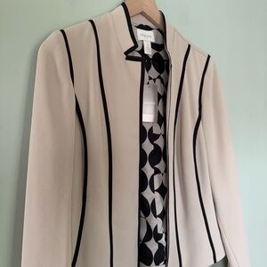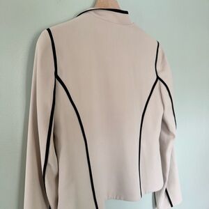 Chico’s women’s contrast pipe blazer jacket in a tan/light brown, and black, with polka dot detail on the lining. Size 4, Chico’s size 0.