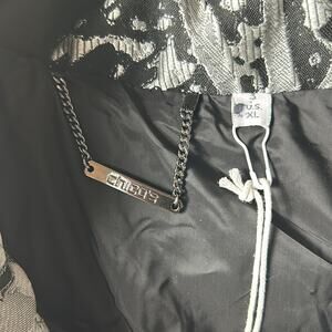 NWT Chico’s black and silver metallic jacquard puffer vest, Chico’s 3/US XL. Mark on brand tag to prevent retail return. New with tag!